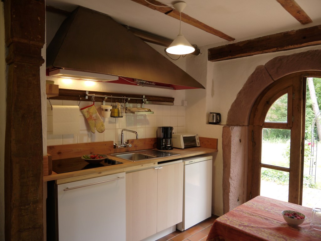 - Eine kleine Küche mit Spüle, Spül- und Kochutensilien, Ceran-Feld mit Abzugshaube, Mikrowelle, kleinem Backofen-Grill, Kühlschrank, Kaffeemaschine, Toaster sowie Geschirr für vier Personen