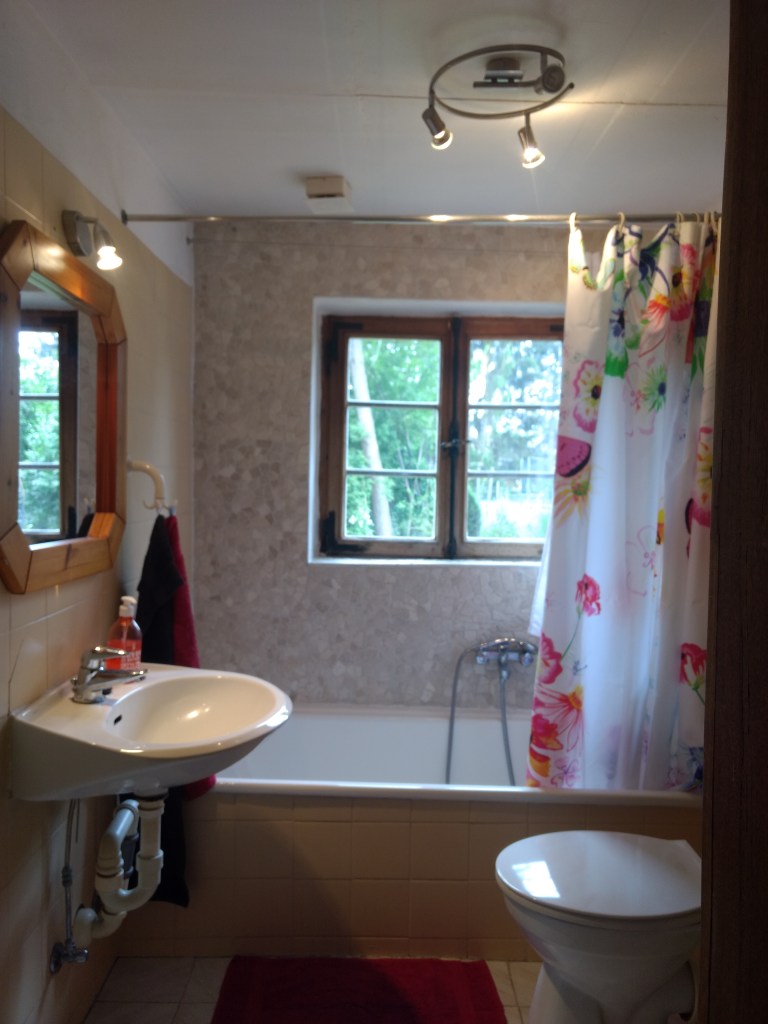 - Ein Tageslichtbad mit Toilette, Duschwanne und Blick ins Grüne (Handtücher, Handseife und Toilettenpapier sind vorhanden)